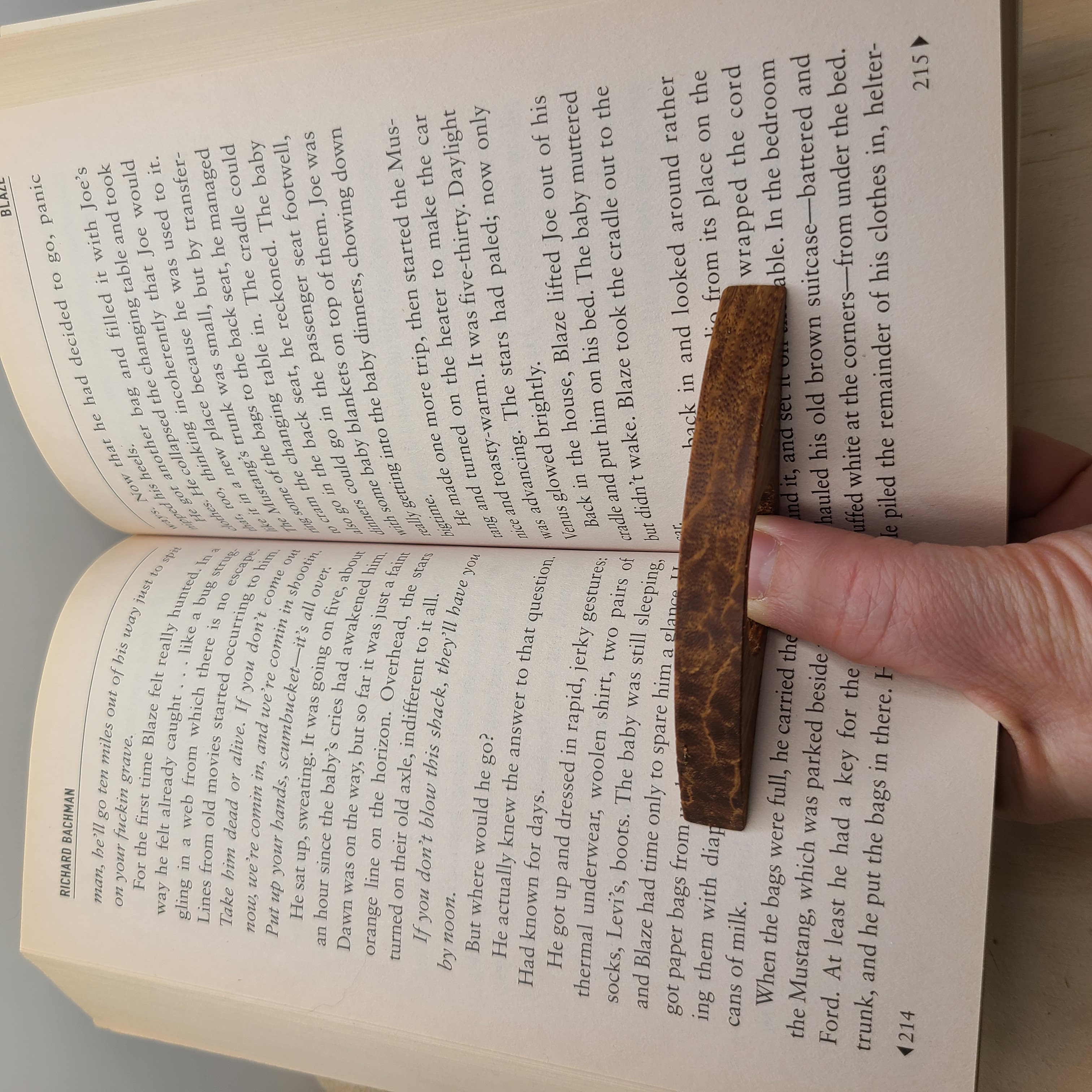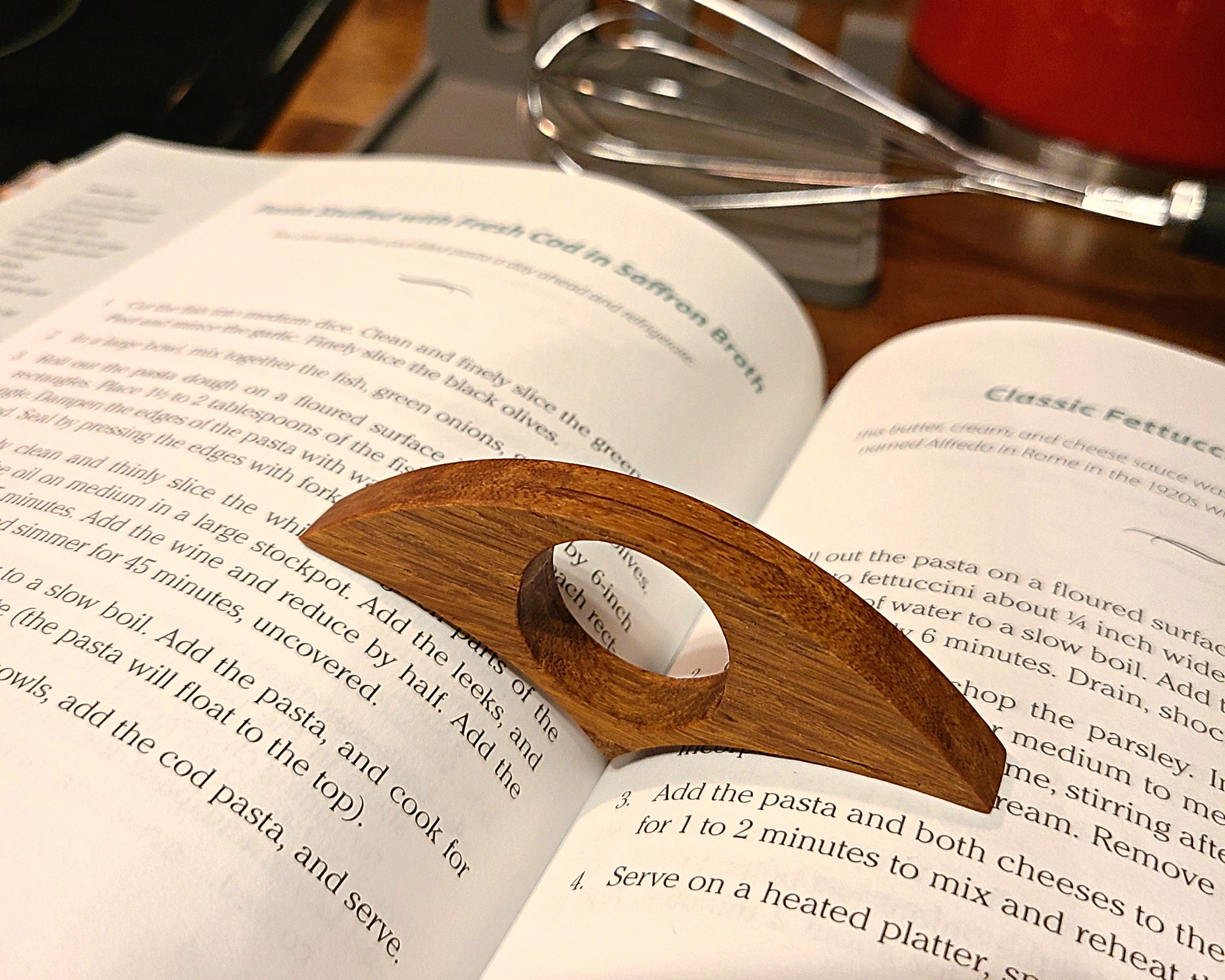 We have created some beautiful hand-made wood Book Page Holders! These are made of reclaimed wood, using a CNC machine, and finished with Danish oil for a lovely smell.